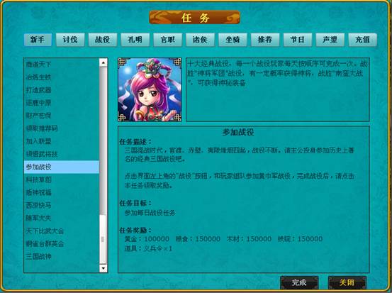 爱上玩家《梦想三国》中的任务丰富是众所周知的,这一次新版到来之际,又为我们带来了“参加战役”、“三国争霸”、“战神争霸”、“南蛮大战”这些非常有意思的游戏任务。当然,还有更多丰厚的游戏奖励哦。